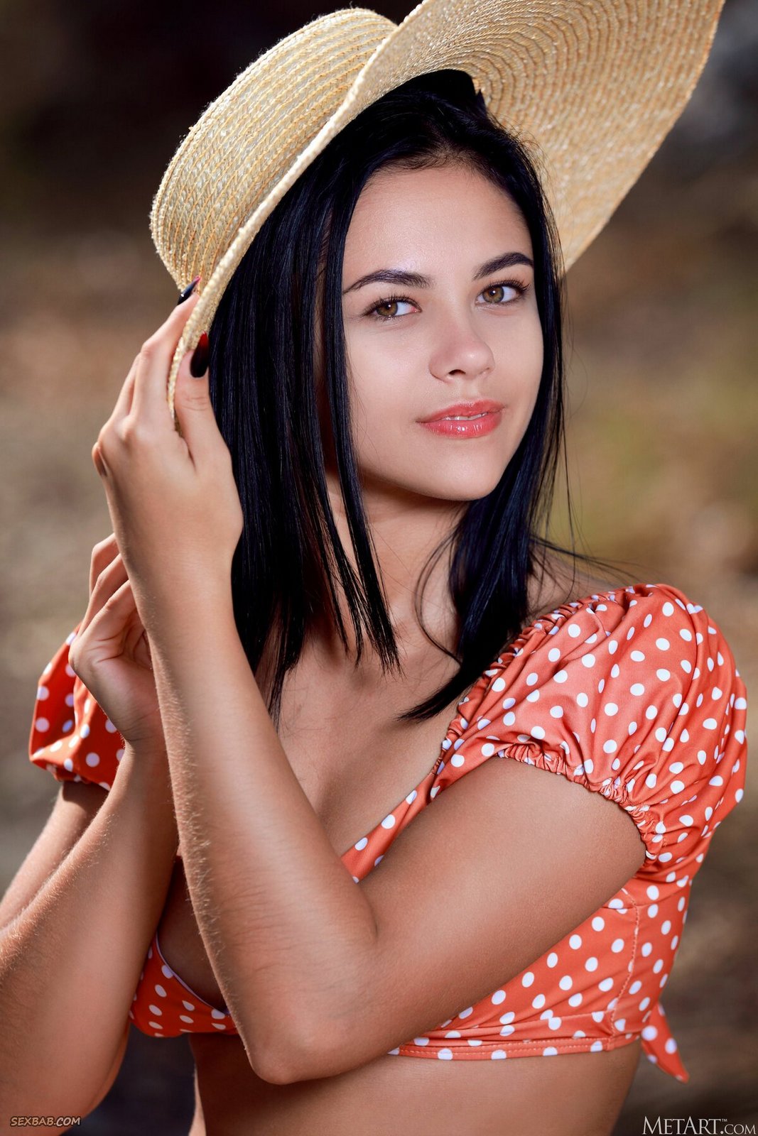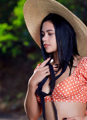 Описание: Кокетливо играясь перед камерой со своей большой шляпой, симпатичная молодая брюнетка в красивом купальнике бесстыже раздевается до гола и позирует на природе. Загорелая стройняшка с сочными упругими титьками ложится на большой горячий камень и развратно раздвигает длинные ноги, похотливо подставляя к камере свою бритую жадную пизду.