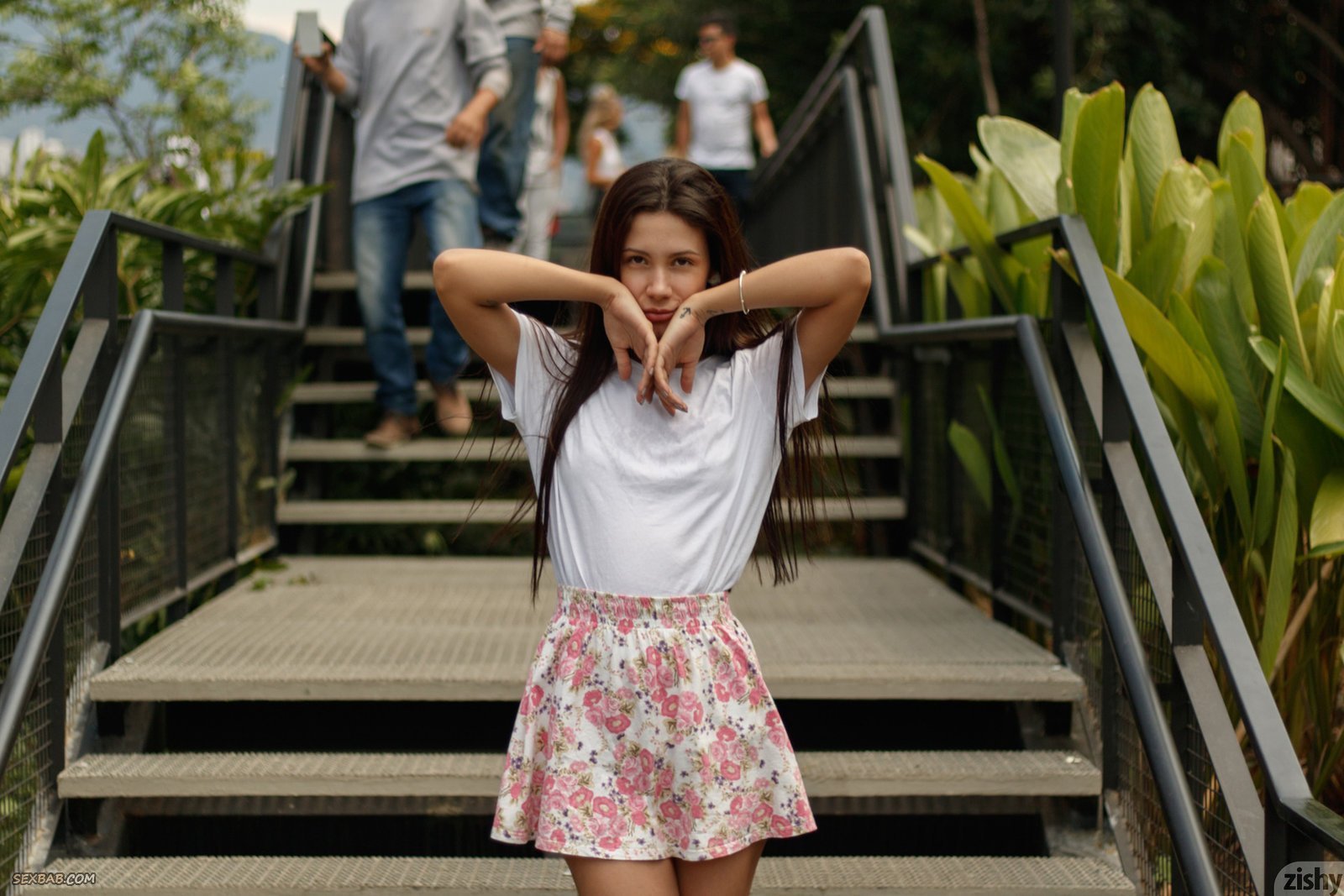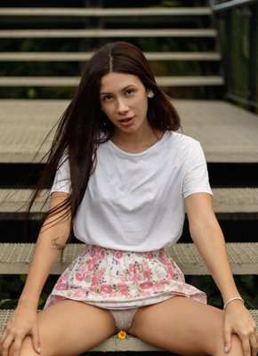 Описание: Обворожительная молодая девушка со стройной фигуркой и пухлыми губками гуляет на улице в короткой юбке и футболке, кокетливо позируя при этом перед фотографом с камерой. Страстно желая понравится нам с вами, сексуальная красавица позволяла взглянуть на её белые кружевные трусики под юбкой, для этого присаживаясь и раздвигая промежность.
