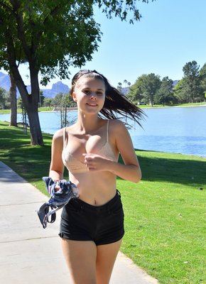 Описание: Симпатичная молодая девушка в коротких шортах и майке, наслаждаясь летним днем, позирует на утренней пробежке. Чередуя в процессе разные необычные ракурсы, сексуальная спортсменка довольно скоро открыла нашему взору свой лифчик, из которого вываливается её аппетитная грудь с красивым сосочком.