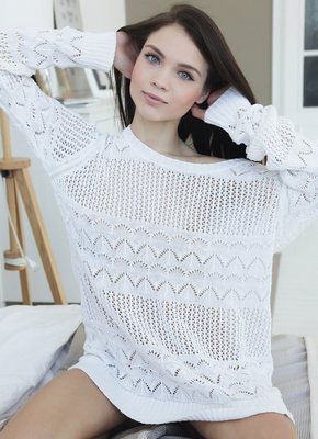 Описание: Очаровательная милая брюнетка в широкой кофте без трусиков нежно ласкает пальчиками свою бритую сладкую киску и чувственно извивается всем телом в большой кровати. Раздевшись до гола, молодая девушка с миниатюрными титьками перепробовала много откровенных поз, засвечивая свои самые интимные места в разных ракурсов.