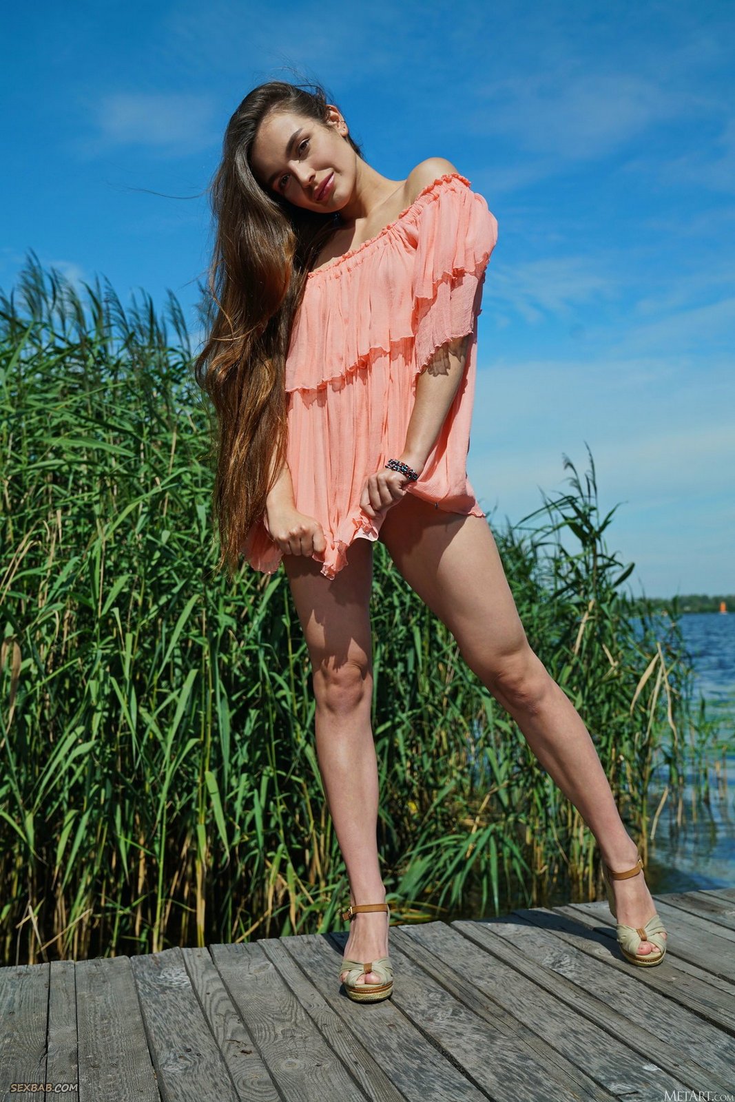 Описание: На деревянном пирсе у красивого озера сексуальная телка медленно сняла с себя короткое платье без трусов и показала на камеру свою бритую сочную письку. Развратная баба чувственно поглаживает свое разгоряченное голое тело и, встав раком, начала похотливо вилять своей аппетитной упругой попкой.