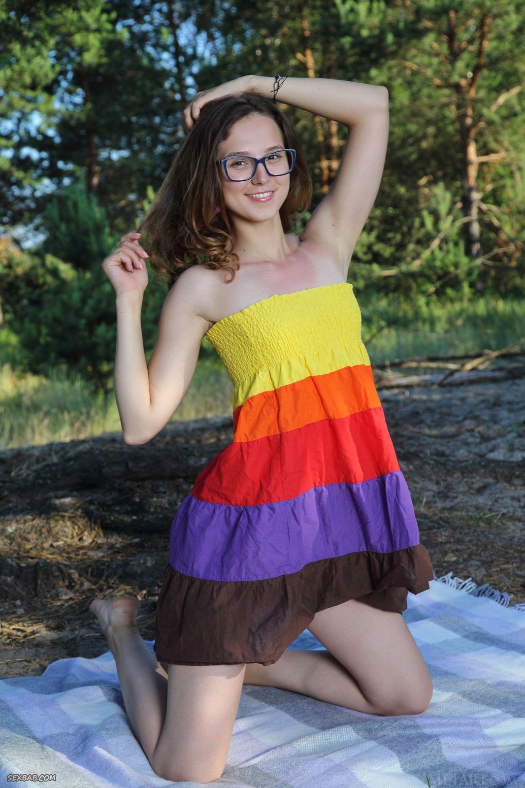 Описание: Оказавшись на природе, скромная милашка в очках решила устроиться на подстилке и немного попозировать, с целью оголить сексуальную и немного тощую попочку. Уже спустя несколько минут молоденькая крошка полностью разделась и начала грациозно выгибаться спинку, что так же позволяло демонстрировать возбуждающую гладко выбритую письку и маленькие сиськи.