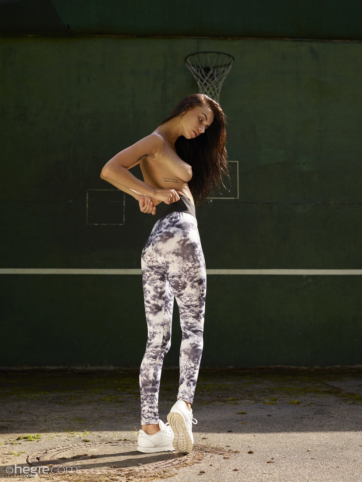 Описание: Выбравшись на пустую баскетбольную площадку, сексуальная молодая красавица со спортивным телом начинает эротично позировать голая, медленно снимая облегающие штаны. Полностью обнажившись, страстная девушка с натуральной грудью в кроссовках присаживалась на корочки и подробно демонстрировала гладко выбритую письку с плоским животиком.