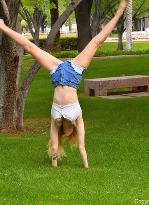 Описание: Соблазнительная гибкая сучка в коротких шортах и белом топике с наслаждением прогуливается в парке и соблазнительно позирует там перед фотографом. Кокетничая и вскоре возбуждаясь от происходящего, сексуальная девушка всё же немного засвечивала бритую письку и натуральные висячие сиськи.