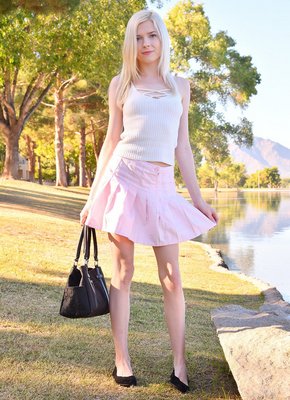 Описание: Решившись на щекотливую фото сессию прямо посреди улицы, стройная блондинка с милым личиком и маленькой грудью широко раздвинула ноги и показала нам белые трусики под юбкой, которые насквозь пропитались её соками. Этого девушке показалось мало и вскоре она стянула с себя нижнее бельё, оставшись при этом в короткой юбочке, но с голой киской.