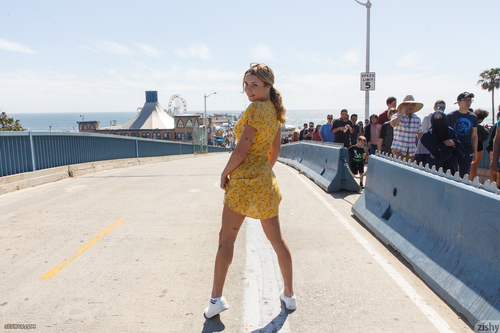 Описание: Обворожительная девушка с милейшей улыбкой гуляет в летнем платье с глубоким декольте, из которого буквально вылазят её огромные сиськи. Желая подогреть уровень нашего возбуждения, блондинка садится на корточки и открывает прелестный вид на трусики под юбкой, за которыми скрывается лоснящаяся щёлка, скучающая по мужскому вниманию.