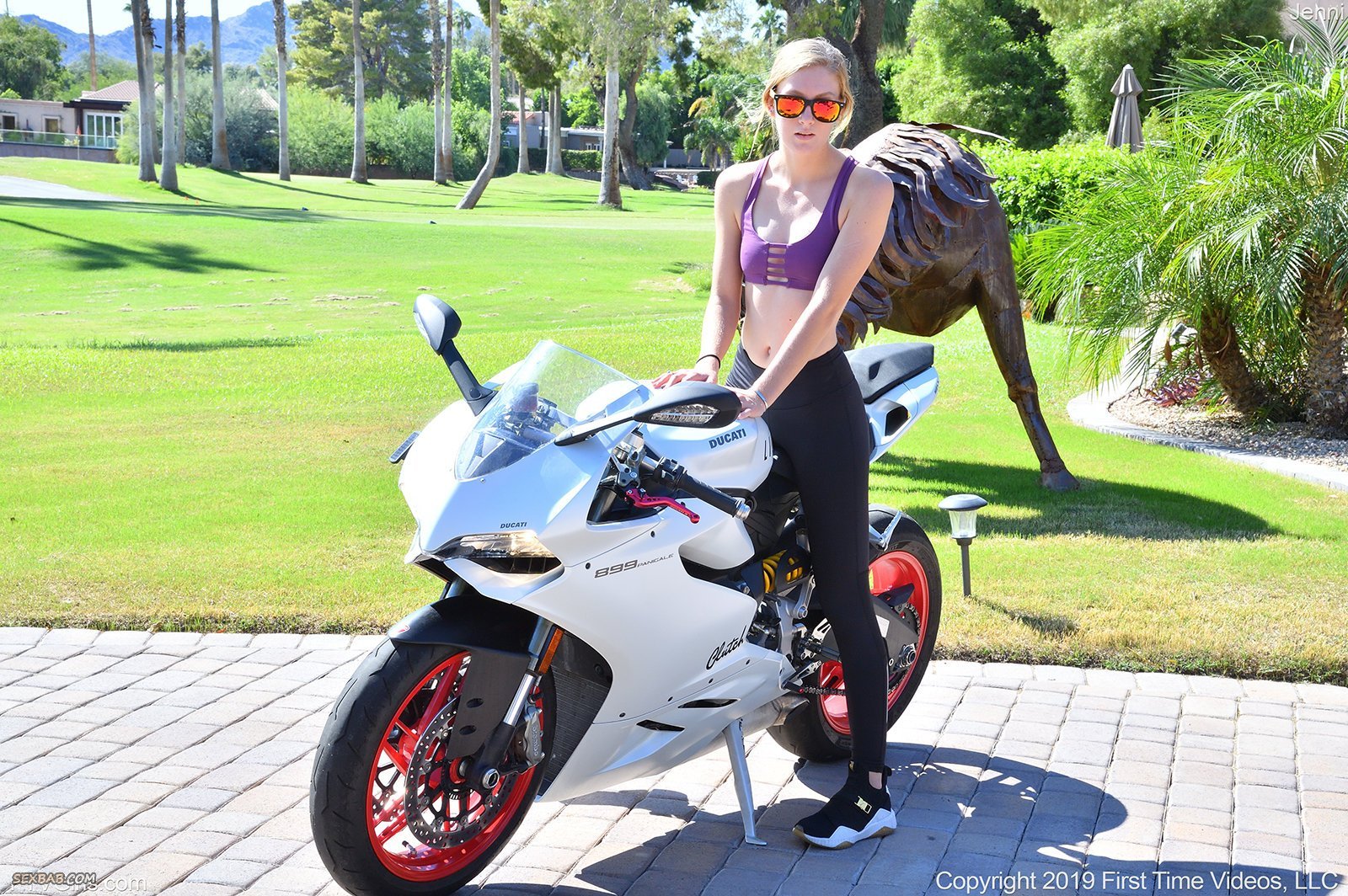 Описание: Прогуливаясь в парке и фотографируясь с мотоциклом, симпатичная блондинка высокого роста решает отправится домой, чтобы там раздеться догола и засветить сексуальное тело. На месте стройная светловолосая девушка стягивает лосины с топиком и засвечивает маленькие сиськи с попкой, порой проникая пальцами в бритую письку.