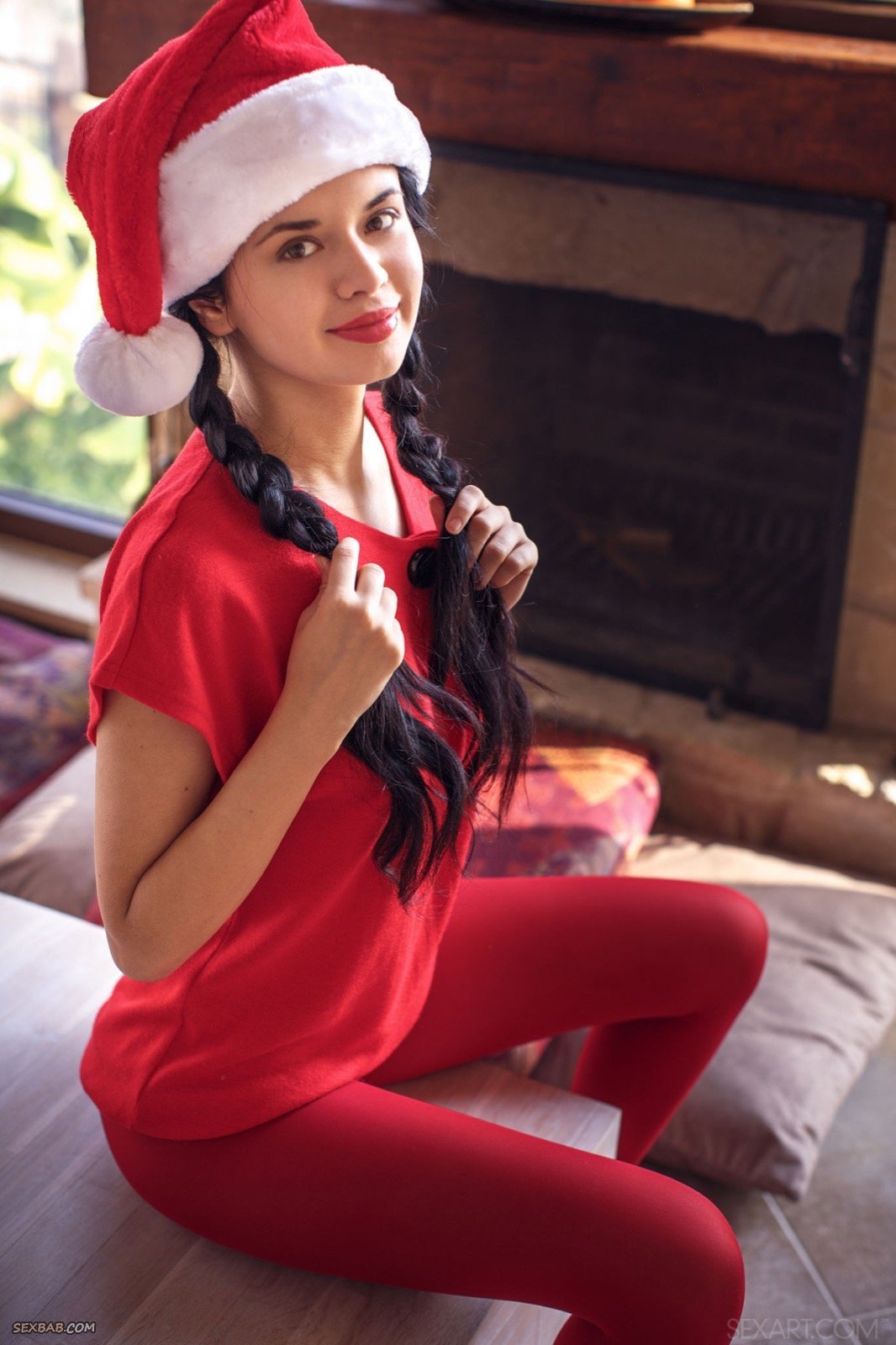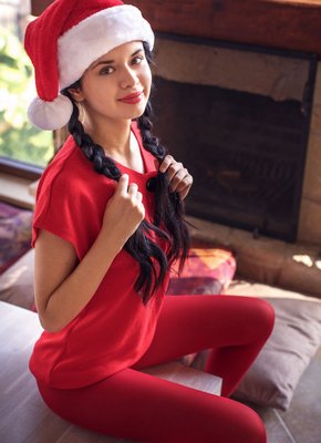 Описание: Молоденькая красивая брюнетка с косичками, устроившись рядом с камином на новый год, начинает эротично позировать и медленно раздеваться, стягивая красные колготки и футболку. Первым делом стройная крошка с длинными ножками выставляет на показ упругие натуральные дойки с торчащими сосочками, а после демонстрирует бритую письку крупным планом, параллельно лаская клитор пальчиками.